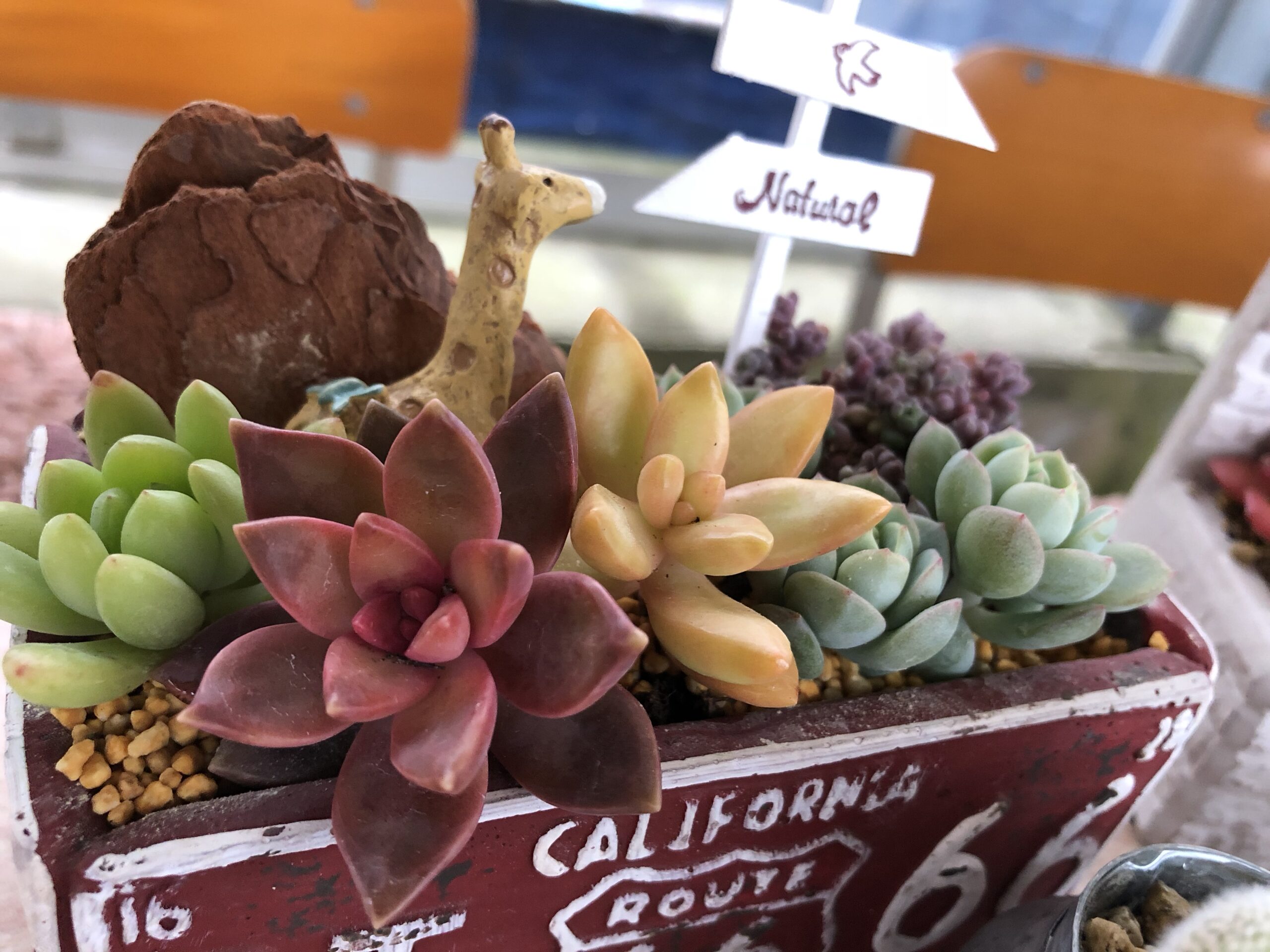 ポップな器と赤が映えるので入る多肉も、カラフルに主張する品種が入っています。春萌え、ブロンズ姫、メイゲツ、群月花、ブレビフォリューム、が入ってます。また、バークチップや白いオリジナルピック、キリンのマスコットなどハッキリと主張してる色合いをチョイスすることで、ずっと見てても飽きない一品になっています。